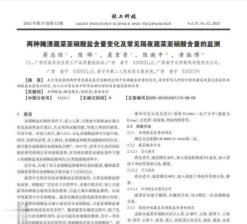 参考文献[1]蒋志维,陈晔,莫素青,等.两种腌渍蔬菜亚硝酸盐含量变化及常见隔夜蔬菜亚硝酸含量的监测[J].轻工科技,2021,37(12):8-9.